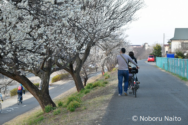 家から自転車で約5分のところに浅川が流れています。その川沿いには、見頃となった梅が甘い香りを漂わせて人々の心を癒してくれています。夕暮れ時に撮影しました。